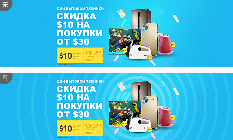 同樣是沒有和有圖案的對比(為了大家看的明顯一點(diǎn)我把圖案加深了一些,因?yàn)槭蔷€條圖案圖片縮小就不是很清晰了)圖案不僅可以是形狀、它也可以是線條。很明顯的感受到第一張圖促銷氛圍已經(jīng)可以滿足了,但是通常我們會(huì)為了讓背景更有細(xì)節(jié)會(huì)添加一些圖案。