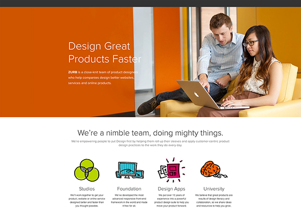 whitespace on web4Zurb是一家網(wǎng)頁設(shè)計(jì)公司,其網(wǎng)頁頂部使用純色,中間圖標(biāo)采用了四種不同顏色,除了這一點(diǎn)點(diǎn)色彩運(yùn)用,網(wǎng)頁的整體設(shè)計(jì)特點(diǎn)還是留白。