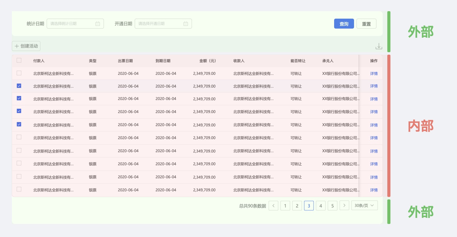 外部:由篩選區(qū)域、操作按鈕區(qū)、分頁(yè)區(qū)共3大類組成。