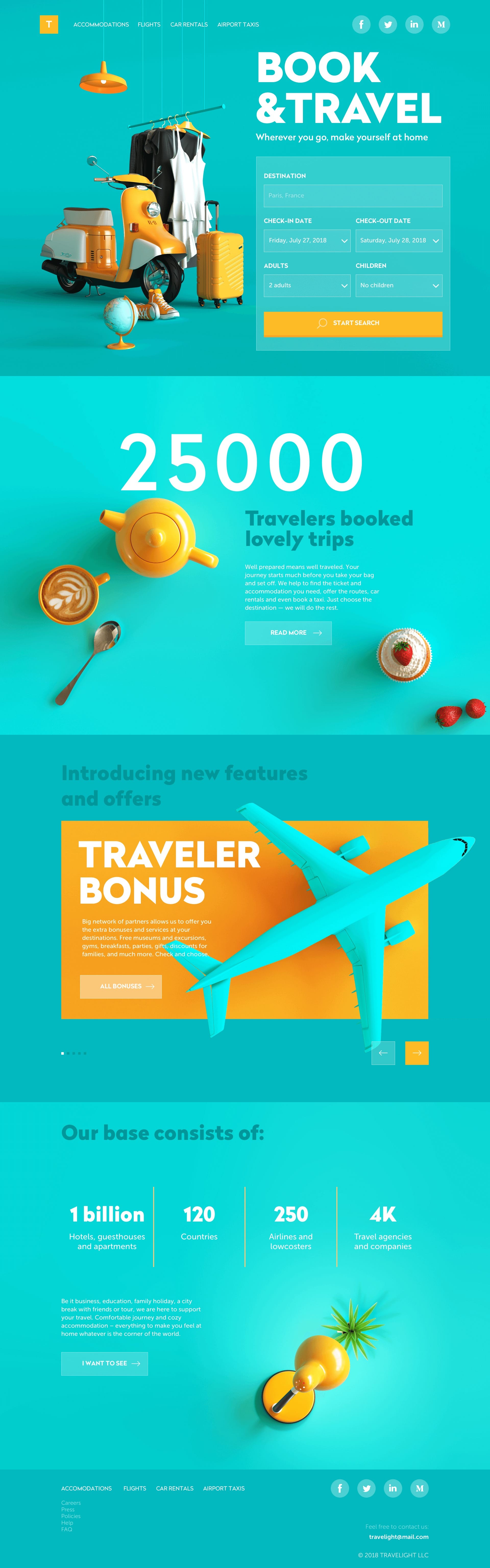 對于出門旅行,絕大多數的用戶都抱有著不小的期待。但是旅行本身并不輕松,需要訂購酒店,需要購買機票和車票,租車,購買門票,同時旅行還意味著非常大量的活動。而這次的概念設計,就是圍繞著預訂服務來展開的。同樣使用了3D建模來構建視覺,諸多和日常出行相關的視覺元素占據了左側的頁面,而右側則是預訂需要填寫的表單內容。整個頁面采用了更加富有活力的配色,降低用戶填寫表單時候的緊張情緒,清晰直觀的頁面布局,讓用戶無需四處摸索,可以直接開始交互。從標題到表單的條目都保有良好的對比度,可以快速掃視閱讀,便于用戶填寫。