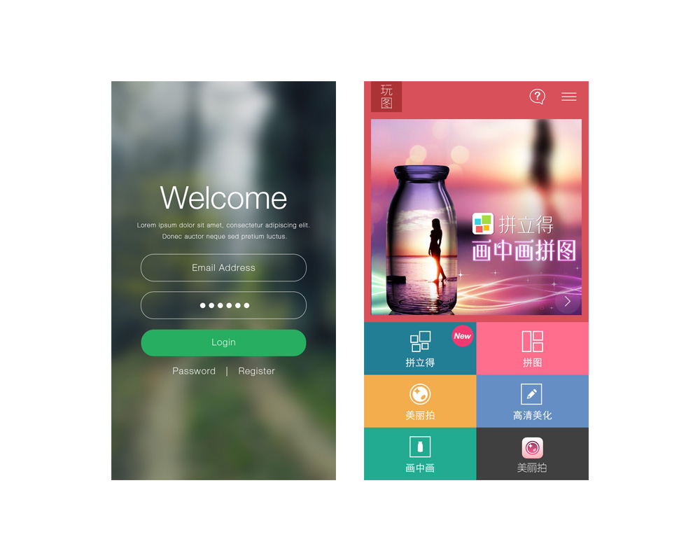 下面的左圖是一個(gè)注冊(cè)頁(yè)面,btn采用了中軸型的構(gòu)圖,清晰地展現(xiàn)了操作項(xiàng)和注冊(cè)流程。右圖采用了上下分割的版面構(gòu)成,上面為圖片展示,下面部分為選項(xiàng)和操作,結(jié)構(gòu)非常清晰。