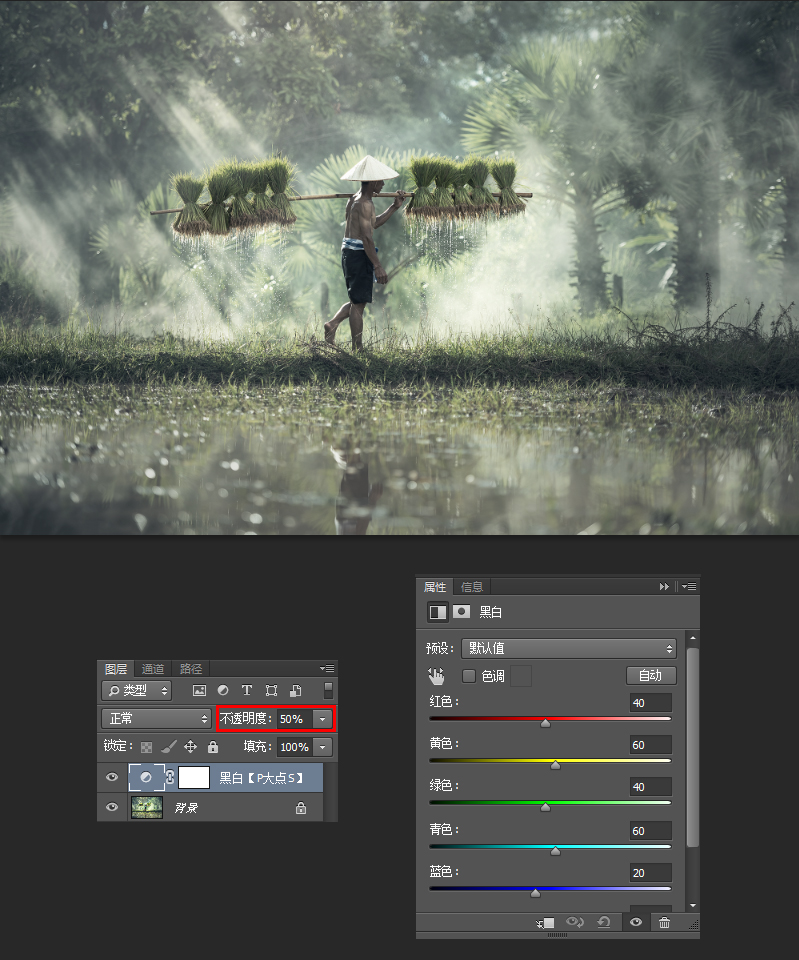 打開我們找到的素材圖,一個(gè)農(nóng)人形象,創(chuàng)建一個(gè)“黑白”調(diào)整層,將圖層不透明度更改為50%。我們可以看到,原圖的色彩被淡化,在黑色調(diào)整層作用下,隱約有一種朦朧感。